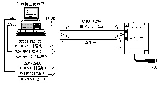 三菱Q系列PLC編程口轉RS485適配器。將Q系列PLC的編程口(RS232)轉換成RS485信號進行遠距離傳輸,最大通信距離可達1200米,內部采用光電隔離抗干擾設計并內置防雷擊浪涌保護電路,特別適合惡劣的工業環境。同時在Q-485AW上還設計了隔離的RS232接口,以滿足PLC與上位機或觸摸屏的近距離通信。